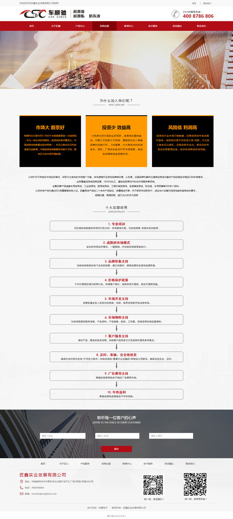 頁(yè)面簡(jiǎn)潔大方,網(wǎng)站以紅、黑、白為主色調(diào),色彩搭配協(xié)調(diào),更能突出重點(diǎn)。招商加盟欄目以單頁(yè)的形式展示,內(nèi)容豐富,更能吸引客戶。