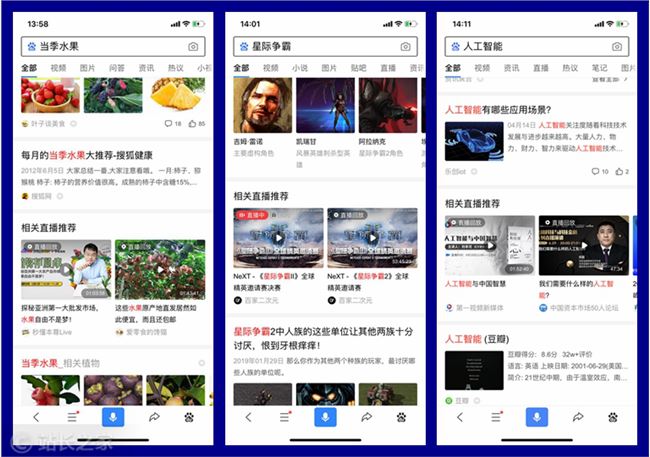 以搜索當季水果、星際爭霸、人工智能等幾個關(guān)鍵詞為例,均能看到搜索首頁展示了與這個關(guān)鍵詞有關(guān)的百度直播視頻。