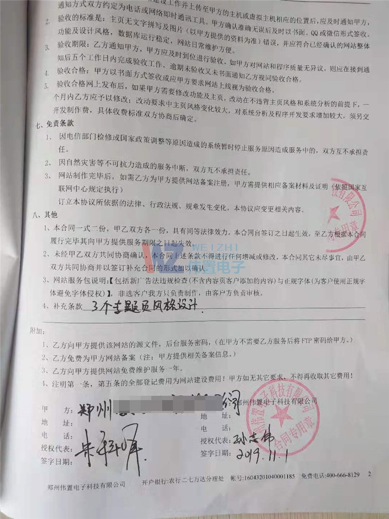 11月1日下午5點(diǎn)半左右,教培云負(fù)責(zé)人來(lái)我們公司做客,雙方就網(wǎng)絡(luò)推廣方面進(jìn)行了長(zhǎng)時(shí)間溝通?蛻艟W(wǎng)站比較老,五六年的網(wǎng)站,在我們推廣師的建議客戶選擇了網(wǎng)站改版合作項(xiàng)目。最后,鄭州教培云教育科技有限公司選擇了與我們偉置網(wǎng)絡(luò)公司簽定了網(wǎng)站建設(shè)合同。以下為雙方簽訂的合同書(shū)。
