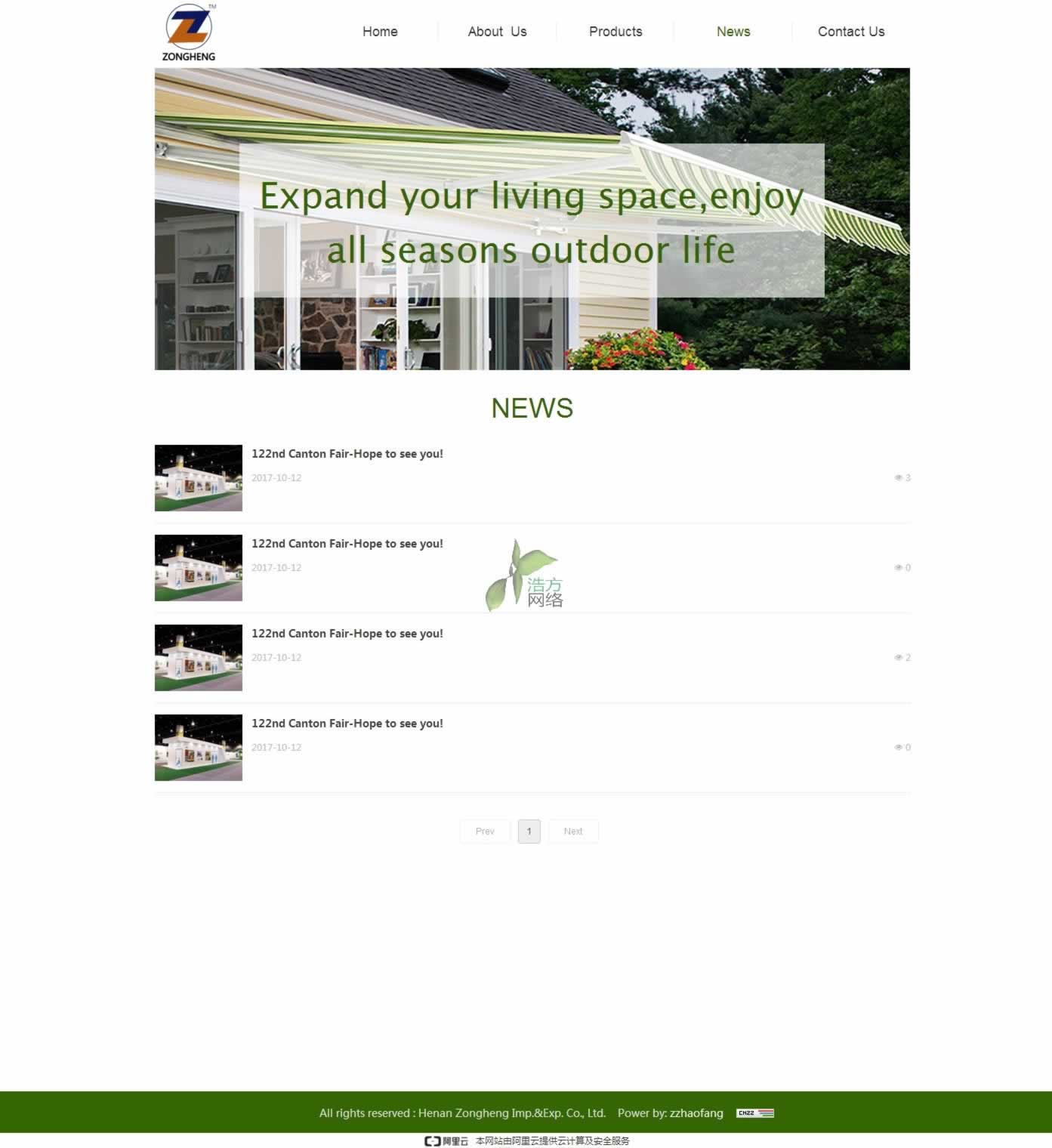 河南縱橫進出口貿(mào)易有限公司遮陽棚英文網(wǎng)站新聞頁面展示效果圖(此遮陽棚網(wǎng)站新聞中心采用文字結(jié)合的形式,展示出縱橫公司十多年的歷史以及獨特優(yōu)勢)